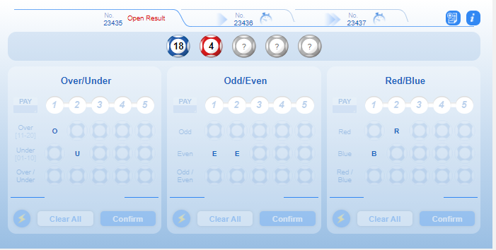 All outcomes must exactly match with the selections in order to win the round. Guess the sequence of the balls to be drawn being Over/Under, Odd/Even and Red/Blue.